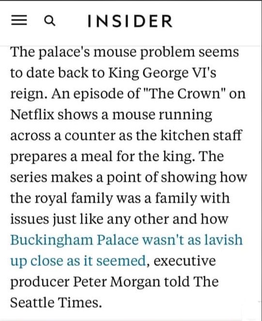 Para quem já viu The Crown, há um momento que vemos a Rainha mãe no Buckingham Palace, vendo TV e um RATO passa perto dela. A rainha não reage, mas e nós, que vimos em casa? Um susto!