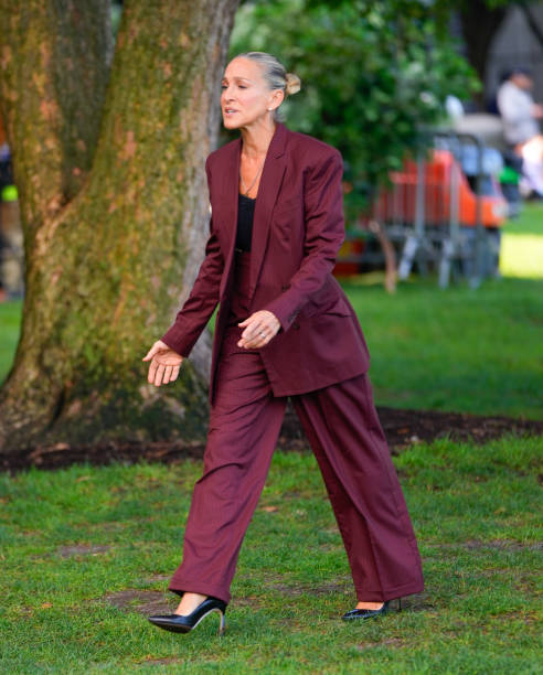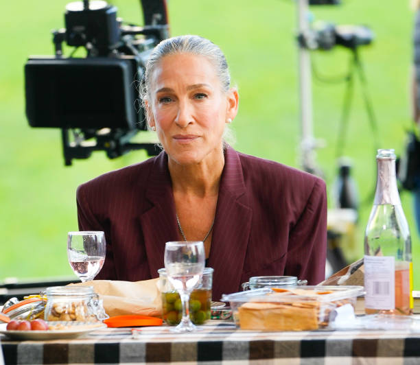 Essa semana, Carrie, com um conjunto de terno sóbrio, foi vista com Charlotte e Miranda em um picnic à três, onde elas estão sérias, mas brindando.