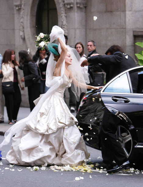Outra imagem da semana foi de Sarah Jessica Parker usando o vestido de casamento do filme, aquele mesmo fatídico do casamento que nunca aconteceu.