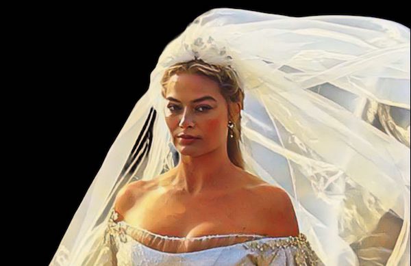 Vestindo um modelo de noiva que muitos definiram como “dramático” por ter os ombros de fora e um longo véu esvoaçante, Margot certamente já estava gravando a sequência na qual Cathy – rompida com Heathcliff – se casa (por amor e por interesse) com Edgar Linton. Uma sequência onde então não vemos Jacob Elordi, que será seu amante torturado.