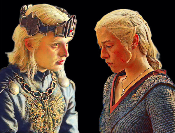 Ainda no livro, o relato escrito pelo arquimaestre Gyldayn, comenta que o ponto de ruptura Ser Corlys com Rhaenyra é quase seco, burocrático. Eventualmente, depois de lutar por ela, Ser Corlys é acusado de se envolver numa conspiração para coroar Addam Velaryon, o jovem cavaleiro de dragão, no lugar de Rhaenyra. Septon Eustace fala em traição aberta, Mushroom sugere desespero pragmático: não se tratava de usurpar o trono, mas de salvar a honra e o futuro dos Velaryon quando tudo em volta já se desmoronava. Afinal, a essa altura, Rhaenyra terá perdido (ou acreditato ter perdido) quase todos seus filhos: após Jacaerys, Viserys II é dado como morto (ele é sequestrado por piratas) e Joffrey, o último filho da rainha com Laenor Velaryon, também morre em King’s Landing.